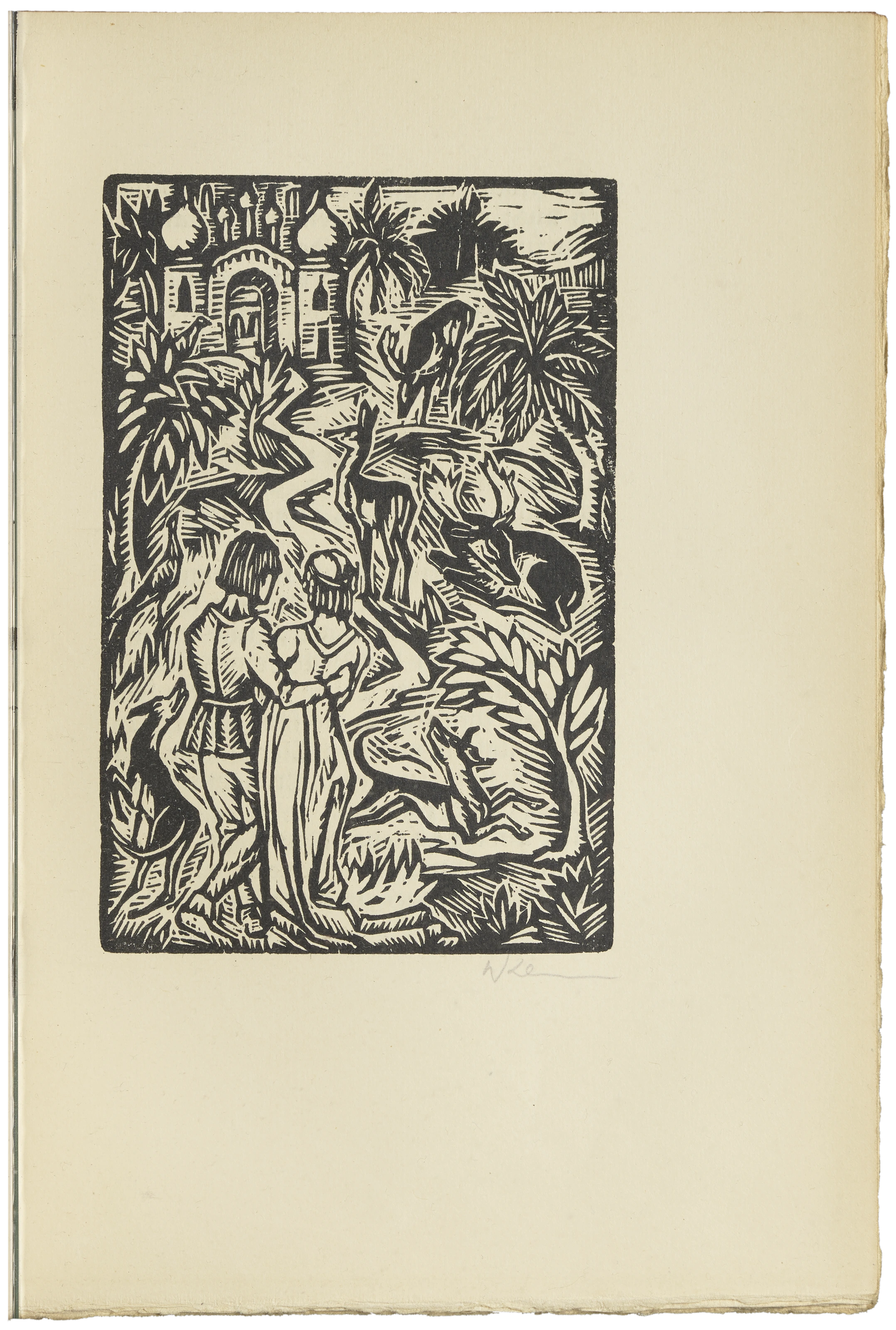 | Material / Technik | furnierte Sperrholzdeckel, mit Kordeln am Wildlederrücken befestigt, offener Falz am Buchrücken, Druck auf van Geldern-Bütten, zahlreiche Holzschnitte |